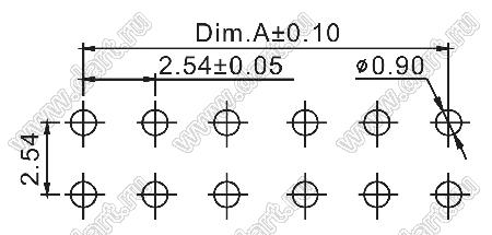 розетки двухрядные прямые (гнездо) на плату для монтажа в отверстия, высота изолятора 3,6 мм; шаг 2,54 x 2,54 мм