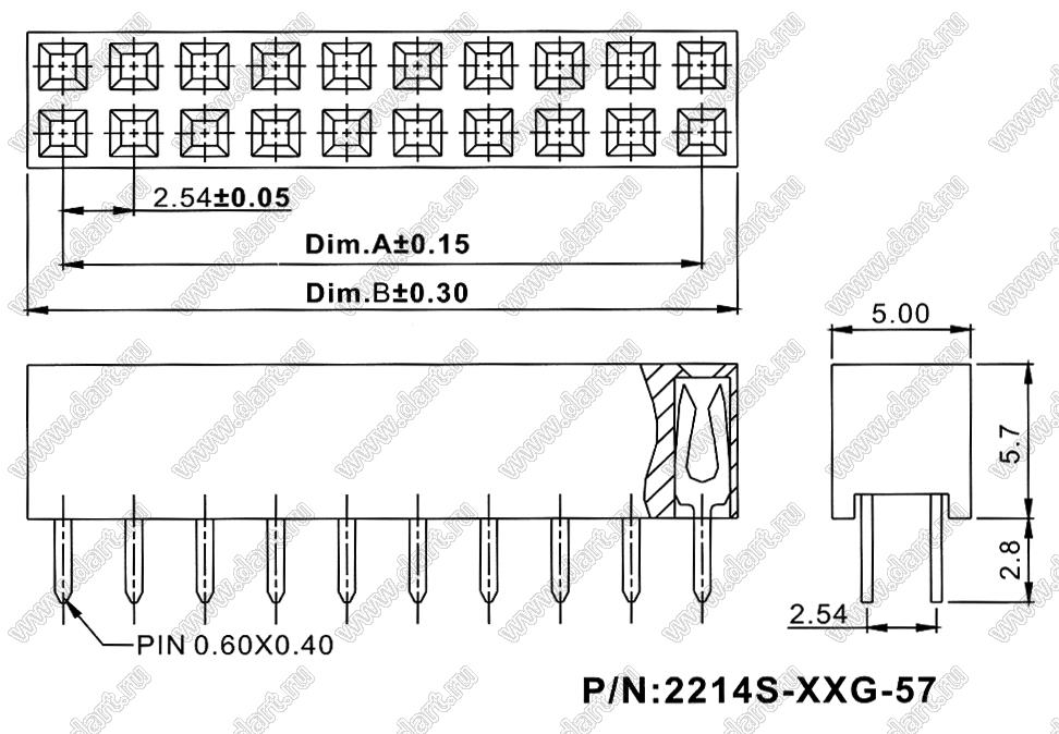 розетки двухрядные угловые (гнездо) на плату для монтажа в отверстия, высота изолятора 5,7 мм; шаг 2,54 x 2,54 мм