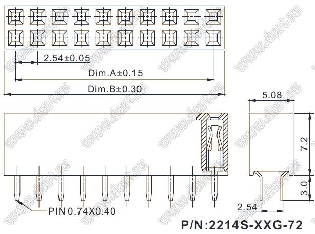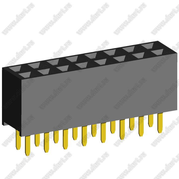 розетки двухрядные прямые (гнездо) на плату для монтажа в отверстия, высота изолятора 7,2 мм; шаг 2,54 x 2,54 мм