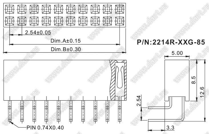 розетки двухрядные угловые (гнездо) на плату для монтажа в отверстия, высота изолятора 8,5 мм; шаг 2,54 x 2,54 мм