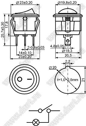 KCD1-106-101O11BBA переключатель клавишный ON-OFF; D=23,0мм; 6A 250VAC/10A 125VAC; толкатель черный/корпус черный; без подсветки;  маркировка "O I"; терминалы 4,8x0,8мм 50280 KCD1-106-101O11BBA 100 шт 26,00 25,31