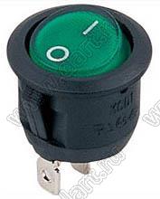 KCD1-106-101N11EBA (R13-112B) переключатель клавишный ON-OFF; D=23,0мм; 6A 250VAC/10A 125VAC; толкатель зеленый/корпус черный; с подсветкой;  маркировка "O I"; терминалы 4,8x0,8мм 35495 KCD1-106-101N11EBA (R13-112B) 100 шт 53,00 51,69