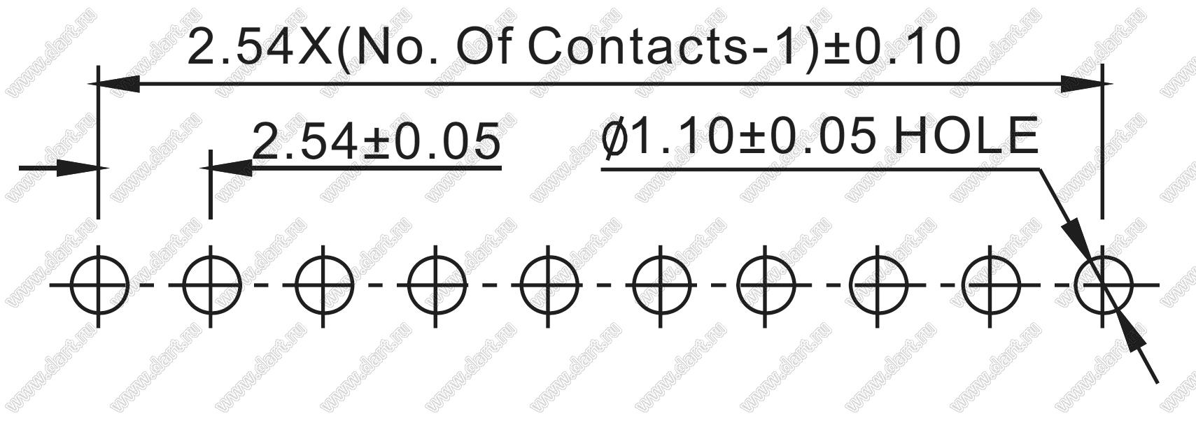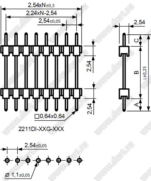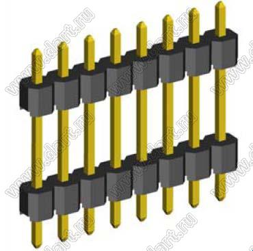 вилки штыревые открытые прямые с двойным изолятором однорядные на плату для монтажа в отверстия, шаг 2,54 мм