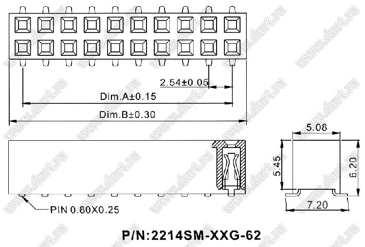 розетки двухрядные прямые на плату для поверхностного (SMD) монтажа, шаг 2,54 x 2,54 мм