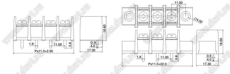 Клеммники барьерные KF65SM (DG65S-A) серии, выводы прямые в плату, шаг 11.00 мм, корпус с монтажными ушами