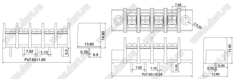 Клеммники барьерные KF25C (DG25C-B) серии, выводы прямые в плату по центру сечения, шаг 7.62 мм