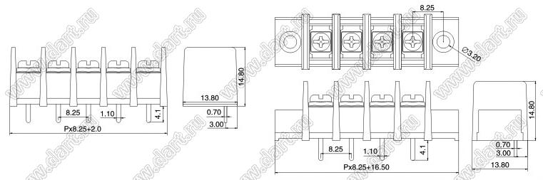 Клеммники барьерные KF35SM (DG35S-A) серии, выводы прямые в плату, шаг 8.25 мм, корпус с монтажными ушами