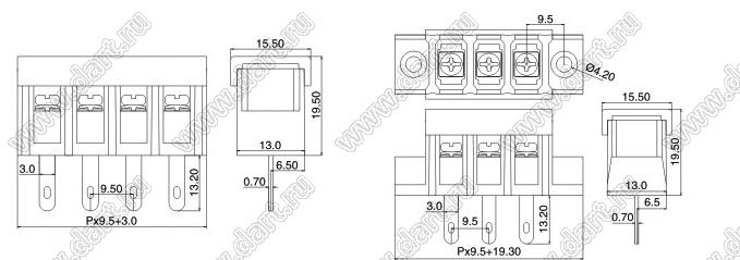 Шаг выводов шаг: 9,5 мм Количество контактов N: 2...24 -конт. Макс. допустимый ток I max: 30/32 А (стандарт UL/ICT) Макс. рабочее напряжение U: 300/750 В (стандарт UL/ICT) Температура рабочая Tраб.: -40...+105 °C Напряжение пробоя (диэлектрическая стойкость) U ≥: 2000 В Сортамент провода A.W.G.: 18-10 Материал винтов: M4, сталь никелировнная Материал контактов: латунь, луженая Материал корпуса: PA66, UL94V-0 Сечение провода: 4 кв.мм Усилие затяжки макс.: 10 кг/см нм |