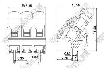 Клеммники винтовые, однорядные, с входами проводов под углом 45 град, шаг 6,35 мм