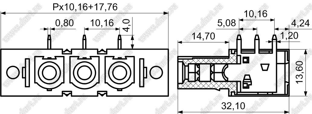 розетки на плату угловые с монтажными ушами, шаг 10,16 мм