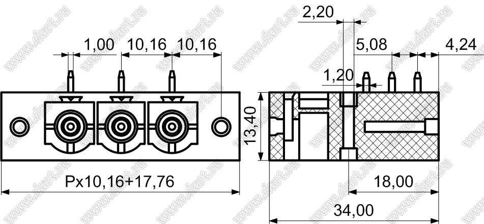 вилки на плату угловые с отверстиями под крепежные винты и закладные гайки, шаг 10,16 мм