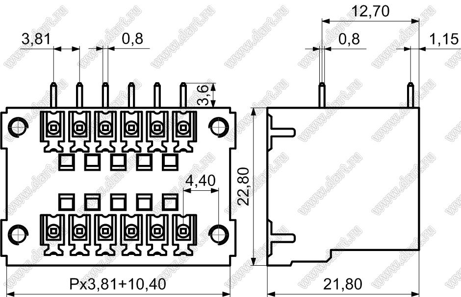 вилки угловые двухрядные на плату с закладными гайками, шаг 3,81 мм