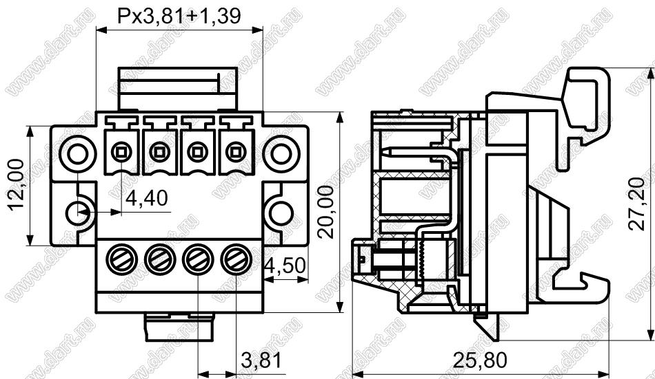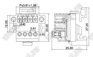 вилки однорядные на провод с угловыми входами проводов под винтовые зажимы на DIN-рейку с монтажными ушами, шаг 3,81 мм