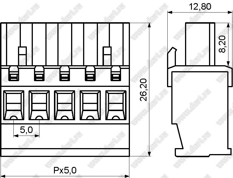розетки однорядные на провод с угловыми входами проводов под винтовые зажимы, шаг 5,0 мм