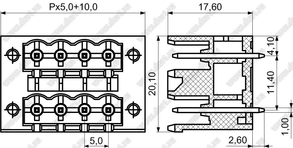 вилки двухрядные прямые на плату с закладными гайками, шаг 5,0 мм