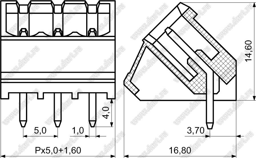 вилки однорядные угловые 45 град. на плату, шаг 5,0 мм