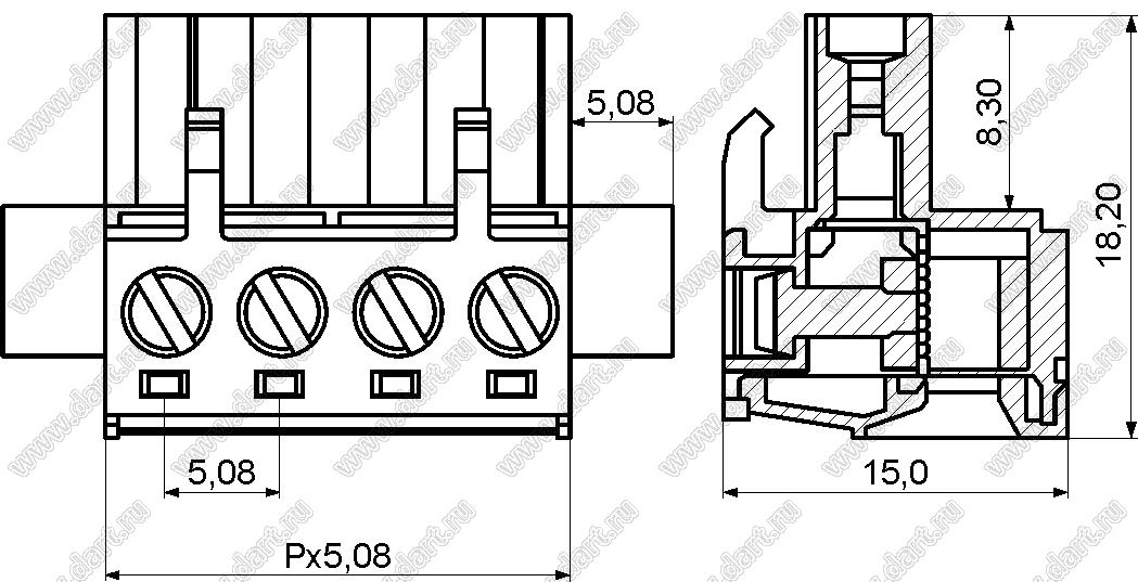 розетки однорядные на провод с прямыми входами проводов под винтовые зажимы и с монтажными ушами, шаг 5,08 мм