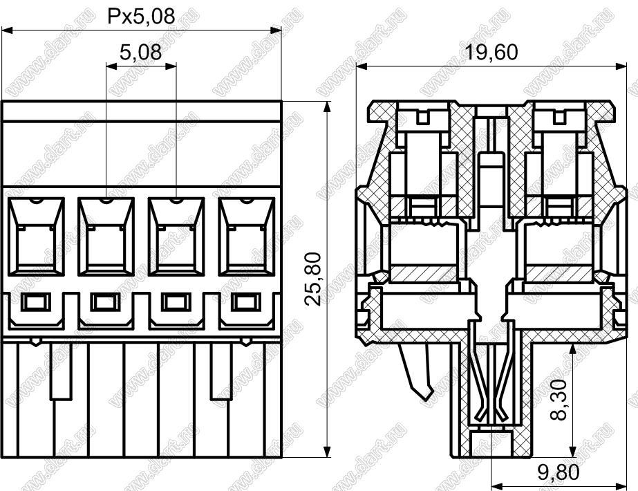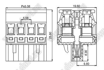 розетки на два провода с угловыми противоположными входами под зажим винтами, шаг 5,08 мм