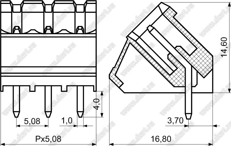 вилки однорядные на плату с входом под 45 град, шаг 5,08 мм