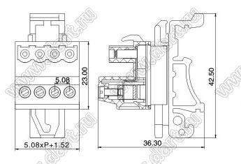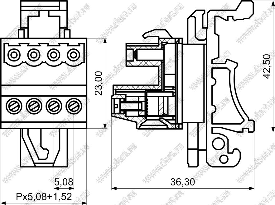 розетки однорядные на DIN-рейку с угловыми входами проводов под винтовые зажимы, шаг 5,08 мм