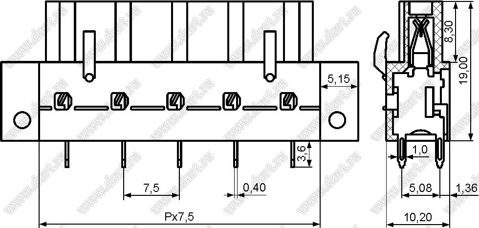 розетки однорядные прямые на плату с монтажными ушами, шаг 7,5 мм