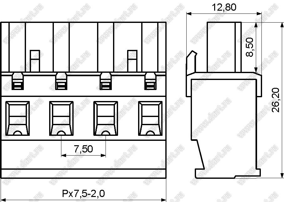 розетки однорядные на провод с угловыми входами проводов под винтовые зажимы, шаг 7,5 мм