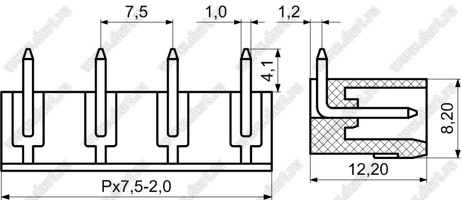 вилки однорядные угловые на плату, шаг 7,5 мм