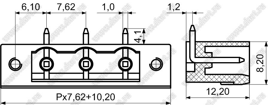вилки однорядные угловые на плату с закладными гайками, шаг 7,62 мм