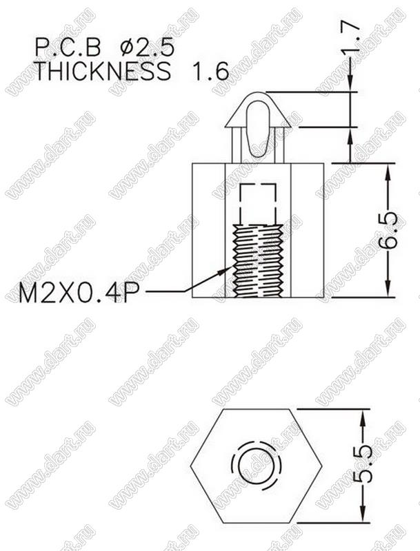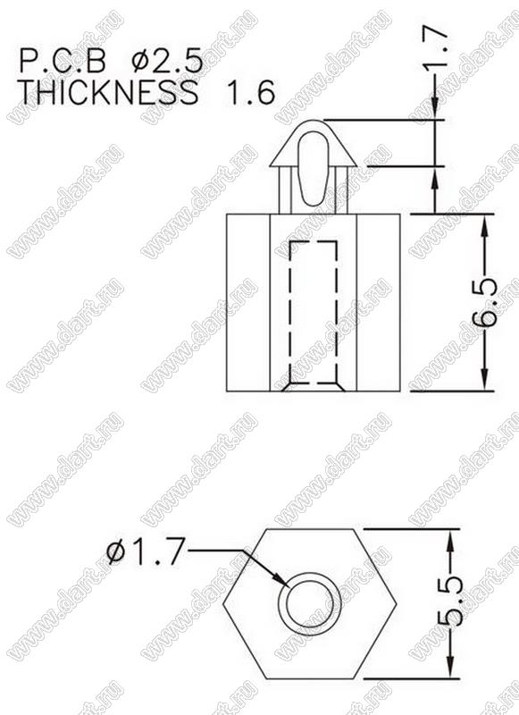 Диаметр отверстия в плате dп: 2,5 мм Толщина платы s: 1,6 мм Материал: нейлон-66 (UL) Класс огнестойкости: 94V-2/94V-0 Цвет: натуральный |