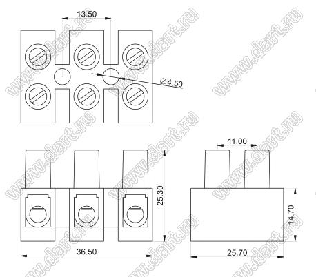 Шаг выводов шаг: 12 мм Количество контактов N: 1...12 -конт. Макс. допустимый ток I max: 30/41 А Макс. рабочее напряжение U: 600/500 В Температура рабочая Tраб.: -40...+105 °C Напряжение пробоя (диэлектрическая стойкость) U ≥: 2500 В Сортамент провода A.W.G.: 14-10 Сечение провода s: 6 кв.мм Материал винтов: M3.5, сталь гальванизированная Материал зажимной части: латунь, никелировнная Материал корпуса: PA66,UL94V-0 Усилие затяжки макс.: 0.5Nm(4.0Lb-in) нм Длина зачистки L: 6-7 мм |