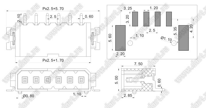 вилки однорядные с горизонтальным входом SMD, шаг 2,5 мм
