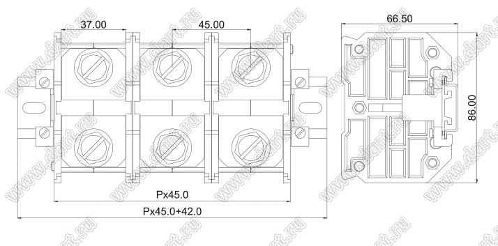 Клеммники на DIN рейку, двухрядные с винтовыми зажимами, с крышкой, шаг 45.0 мм