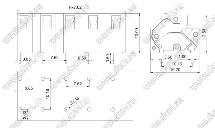 Клеммники нажимные, прямые, с входами проводов под углом 45 град, шаг 7,62 мм