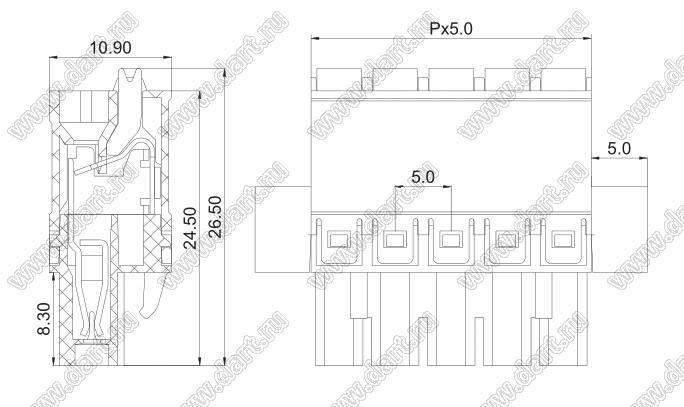 розетки однорядные на провод с прямыми входами проводов под пружинные зажимы, с монтажными ушами, шаг 5,0 мм