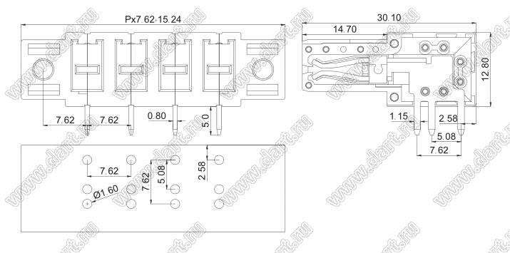 розетки угловые на плату, с монтажными ушами, шаг 7,62 мм