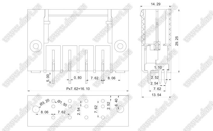 вилки на плату прямые, с отверстиями под крепежные винты и закладные гайки, шаг 7,62 мм