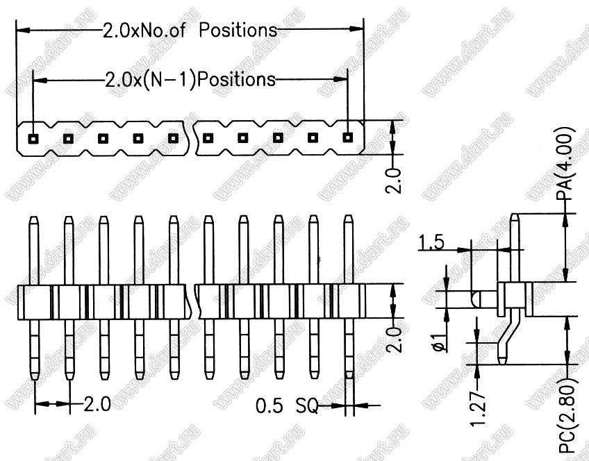 Вилки штыревые однорядные для поверхностного (SMD) монтажа горизонтальные с направляющими в плату (шаг 2,0 мм)