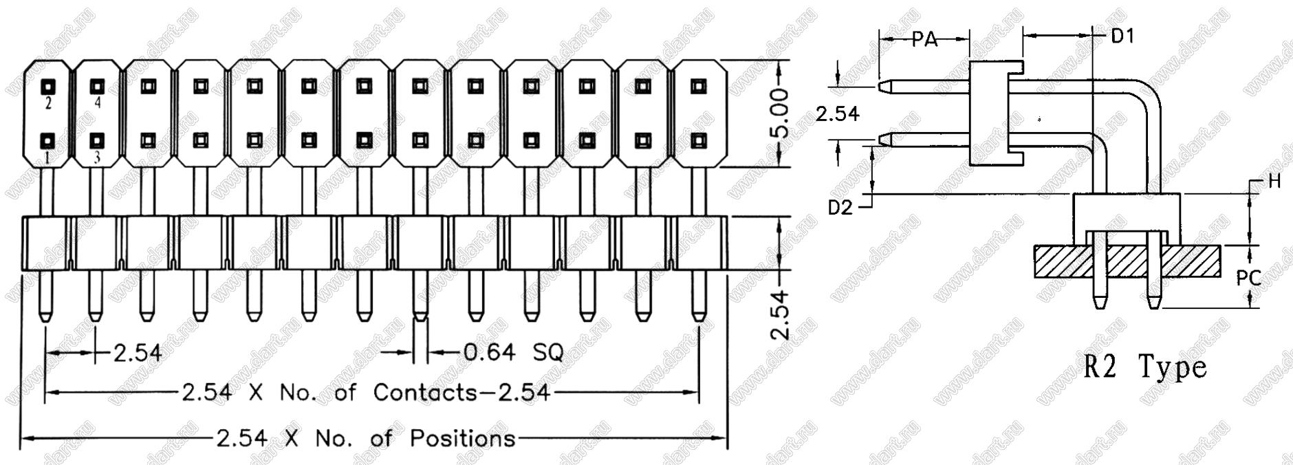 Штыри двухрядные угловые с двойным изолятором, тип R2