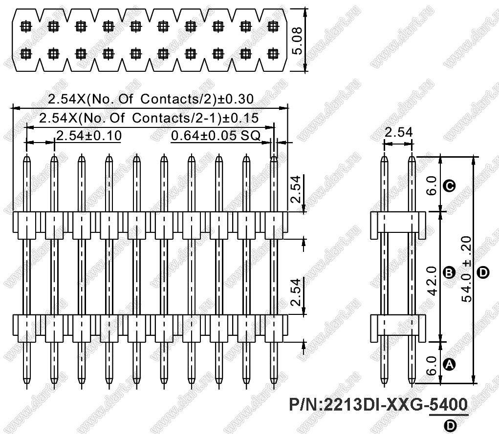 вилки открытые прямые с двойным изолятором двухрядные на плату для монтажа в отверстия, шаг 2,54 x 2,54 мм