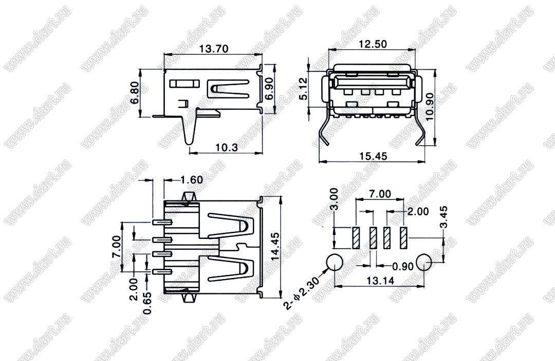 Каталог > Электронные компоненты, радиодетали > Разъёмы (соединители, переходники) > Разъемы USB > Разъемы USB-A > Разъемы USB 2.0 тип A > US01-146 (USBA-F-SM) USB Famale SMT 90° A type with PEG
