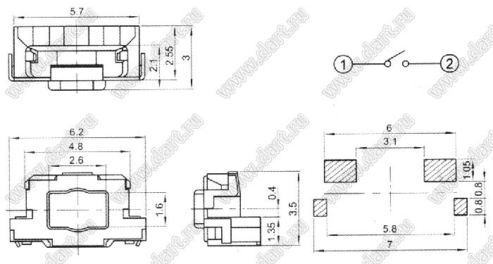 Каталог > Электронные компоненты, радиодетали > Переключатели, кнопки > Переключатели тактовые (TACT, тактовые кнопки) > Тактовые кнопки SMD (для поверхностного монтажа) > 2,5x5,7 мм > THAM16 > THAM16