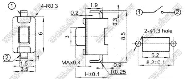 Каталог > Электронные компоненты, радиодетали > Переключатели, кнопки > Переключатели тактовые (TACT, тактовые кнопки) > Тактовые кнопки SMD (для поверхностного монтажа) > 3,5x6,0 мм > TVBR14 серия > TVBR14-4.3