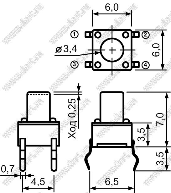 Каталог > Электронные компоненты, радиодетали > Переключатели, кнопки > Переключатели тактовые (TACT, тактовые кнопки) > Тактовые кнопки прямые для монтажа в отверстия платы > 6,0x6,0 мм > TC-0104-X (TVDP01-7.0, TS6670-250AHO, SWT-6, SWT20-7, DTS-63, IT-1109А, KAN0610-0731B)