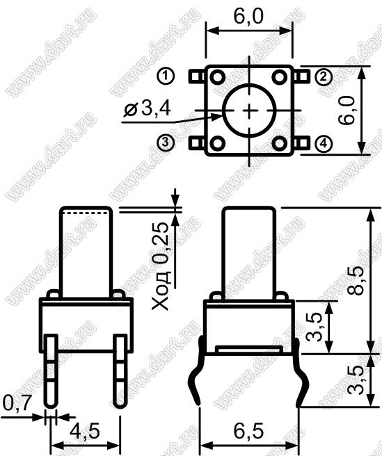 Каталог > Электронные компоненты, радиодетали > Переключатели, кнопки > Переключатели тактовые (TACT, тактовые кнопки) > Тактовые кнопки прямые для монтажа в отверстия платы > 6,0x6,0 мм > TC-0107-X (TVDP01-8.5, TS6685-250AH, SWT20-8.5)