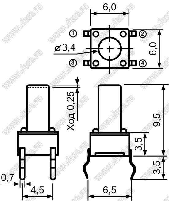 Каталог > Электронные компоненты, радиодетали > Переключатели, кнопки > Переключатели тактовые (TACT, тактовые кнопки) > Тактовые кнопки прямые для монтажа в отверстия платы > 6,0x6,0 мм > TC-0108-X (TVDP01-9.5, 0695, TS-A4PS-130, SWT20-9.5, DTS-65, KAN 0611-951A)