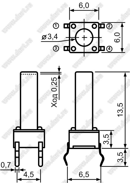Каталог > Электронные компоненты, радиодетали > Переключатели, кнопки > Переключатели тактовые (TACT, тактовые кнопки) > Тактовые кнопки прямые для монтажа в отверстия платы > 6,0x6,0 мм > TC-0110-X (TVDP01-13.5, 06135, TS-037 H=13,5mm, SWT20-13.5)