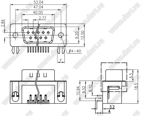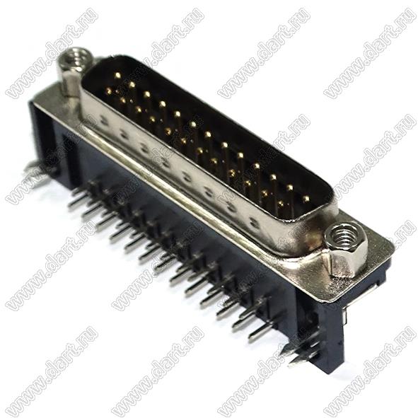 Каталог > Электронные компоненты, радиодетали > Разъёмы (соединители, переходники) > Разъемы D-SUB > DS1037-xxX (5504-xxX, DRB-xxX) серия: вилки и розетки D-SUB угловые для пайки в плату > DS1037-25M-D (5504-25P-B, DRB-25MB)