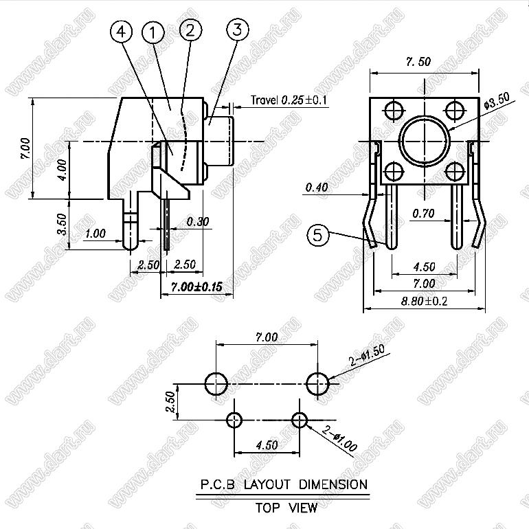 Каталог > Электронные компоненты, радиодетали > Переключатели, кнопки > Переключатели тактовые (TACT, тактовые кнопки) > Тактовые кнопки угловые для монтажа в отверстия платы > TC-0206-X (0780, TS-A3PV-130)