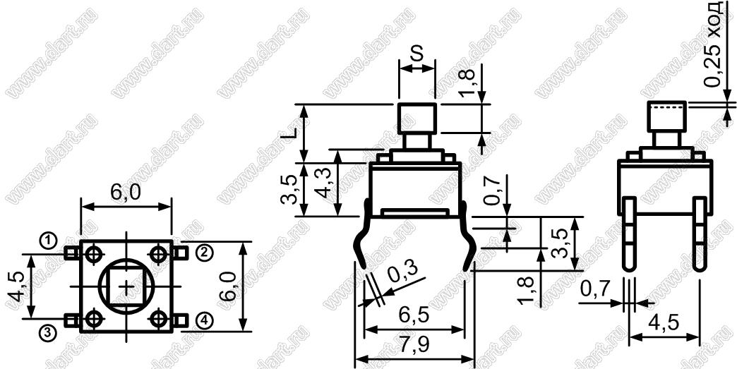 Каталог > Электронные компоненты, радиодетали > Переключатели, кнопки > Переключатели тактовые (TACT, тактовые кнопки) > Тактовые кнопки прямые для монтажа в отверстия платы > 6,0x6,0 мм > TSF6673-100AH (TC-2402-X,0673, TS-37B)