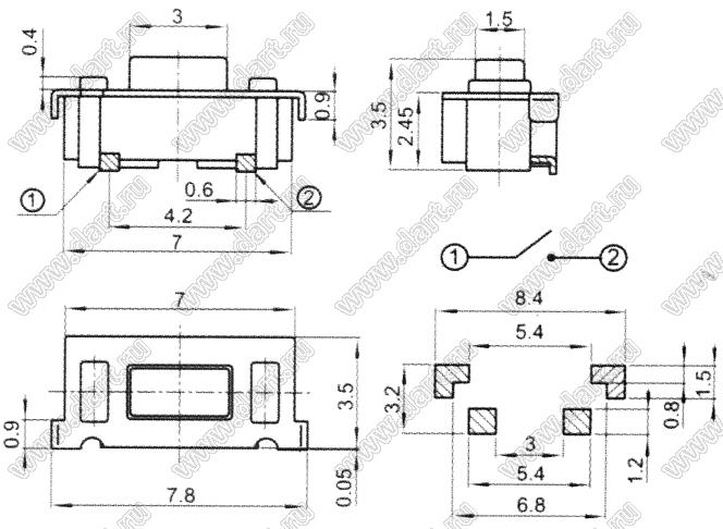 Каталог > Электронные компоненты, радиодетали > Переключатели, кнопки > Переключатели тактовые (TACT, тактовые кнопки) > Тактовые кнопки SMD (для поверхностного монтажа) > 2,5x7,0 мм > THBM03 > THBM03-T/R (TD-15XA-Y-T/R, IT-1188E, SWT-11, SWT 7x3.5-R)